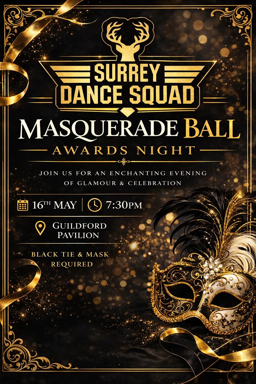 You are warmly invited to our Annual Dance Awards Masquerade Ball — an enchanting evening where elegance meets celebration. Join us as we honour the incredible achievements of our dancers in a night filled with music, mystery, and magic.