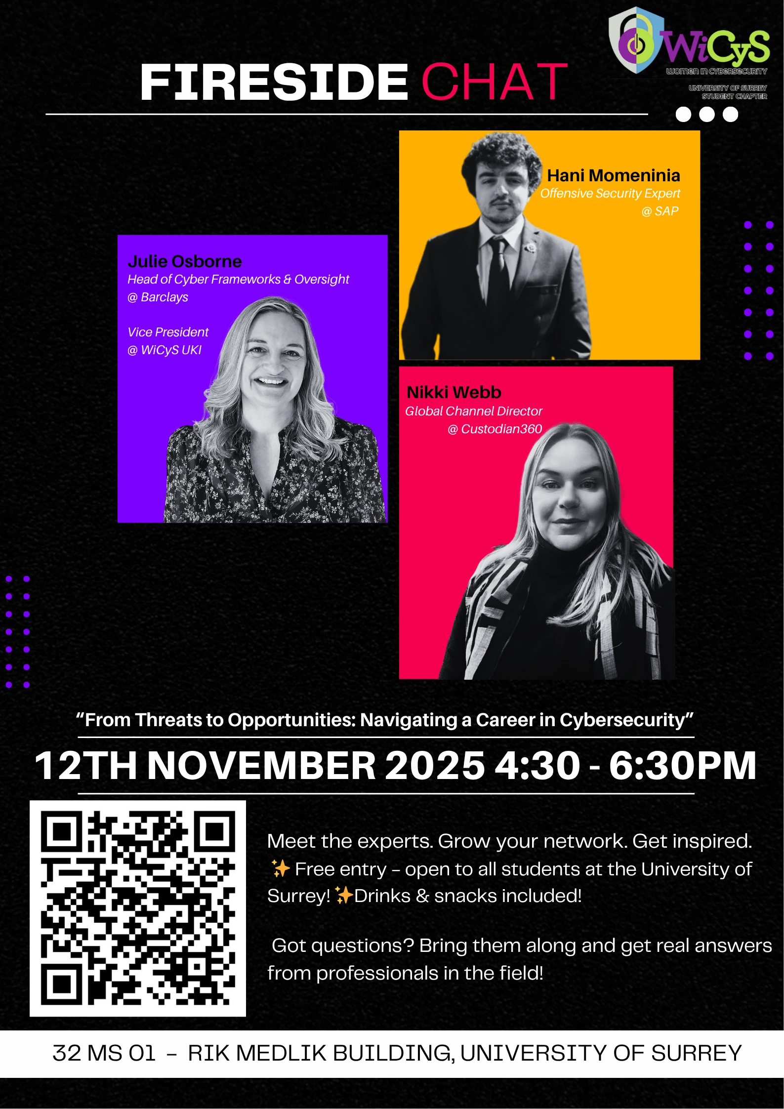 ✨ WiCyS Surrey Student Chapter is thrilled to host our upcoming Fireside Chat! ✨