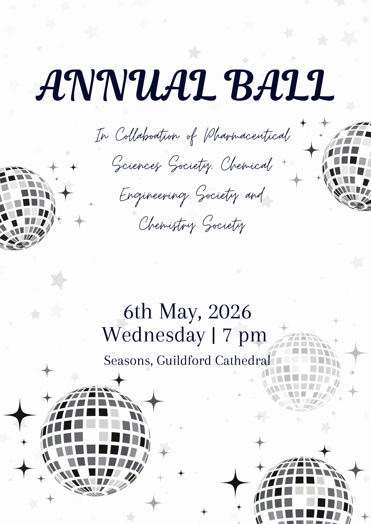 Set against the stunning backdrop of Seasons at Guildford Cathedral, this formal event promises a vibrant atmosphere filled with music, dancing, and the chance to unwind with peers across disciplines. Whether you're looking to celebrate the academic year, meet new people, or simply enjoy a sophisticated night out, the Annual Ball offers the perfect setting.