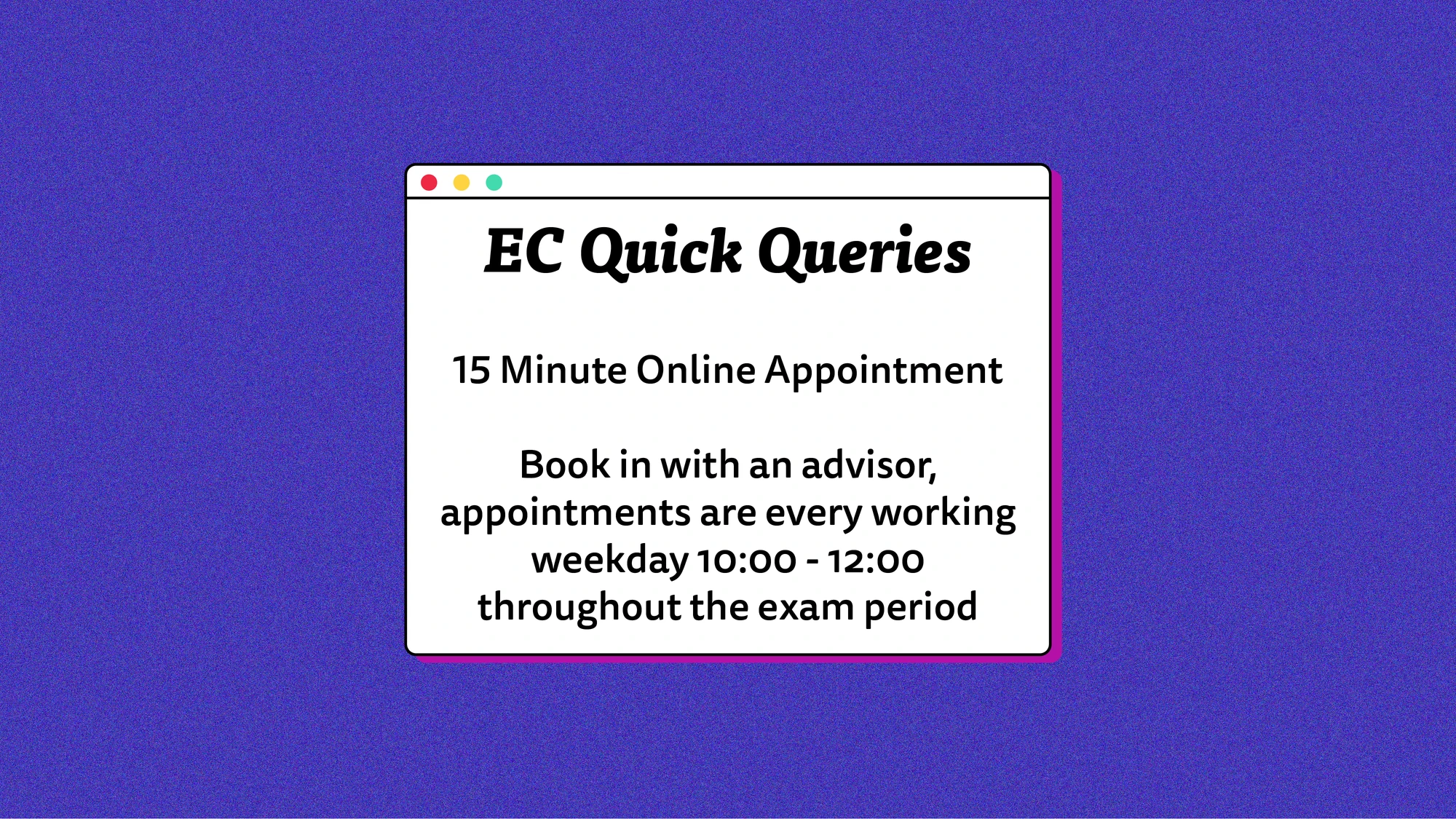 Running Monday to Friday throughout the whole exam period (from 10am - 12pm). If you query is very complicated, we will book you in for a follow up meeting asap!