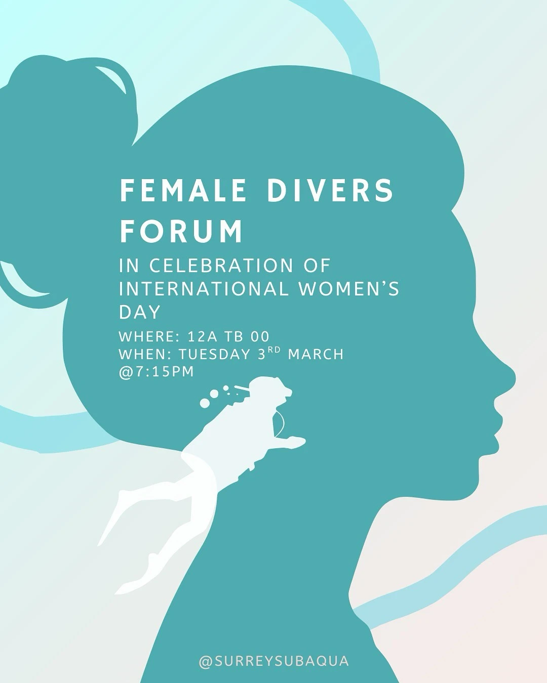 In Celebration of International Women's Day. The event is a safe place for any female divers or women that want to get into diving to ask any questions they might have and discuss topics that may affect women more than men.