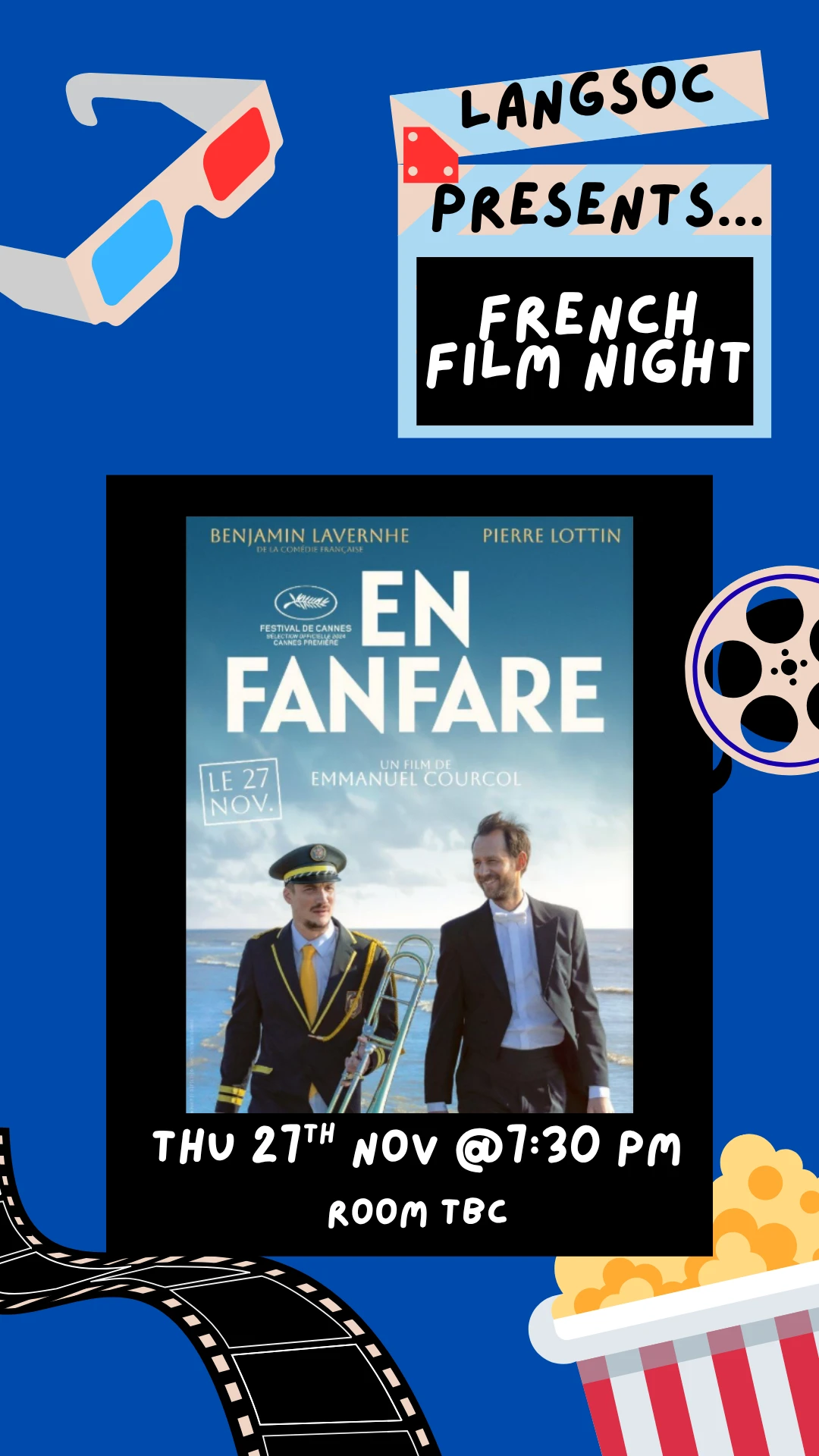 Join LangSoc for a relaxed screening of 'En Fanfare' (The Marching Band). A warm, funny, and heartfelt French film following the unexpected reunion of a father and son as they navigate family, music, and the chaos that comes with both.