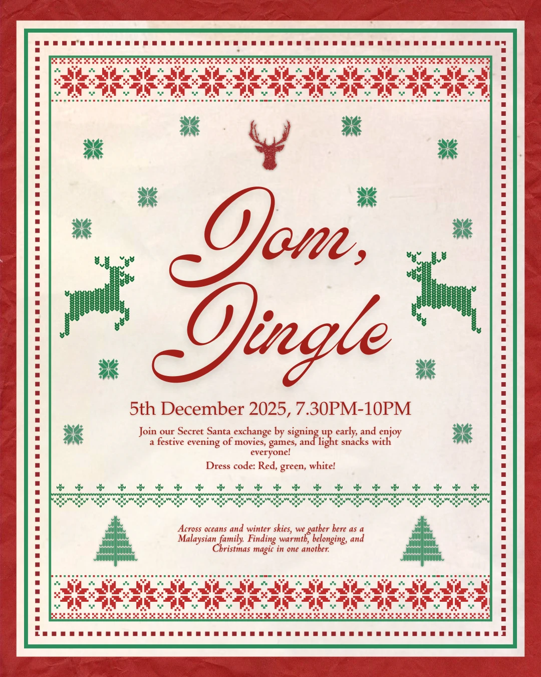 Before some of us head back to Malaysia for the holidays, let’s gather for a cozy night of Christmas cheer! Secret Santa fun (remember to sign up!), festive games, a holiday movie, and light snacks to keep us warm through the winter evening. ❄️☃️