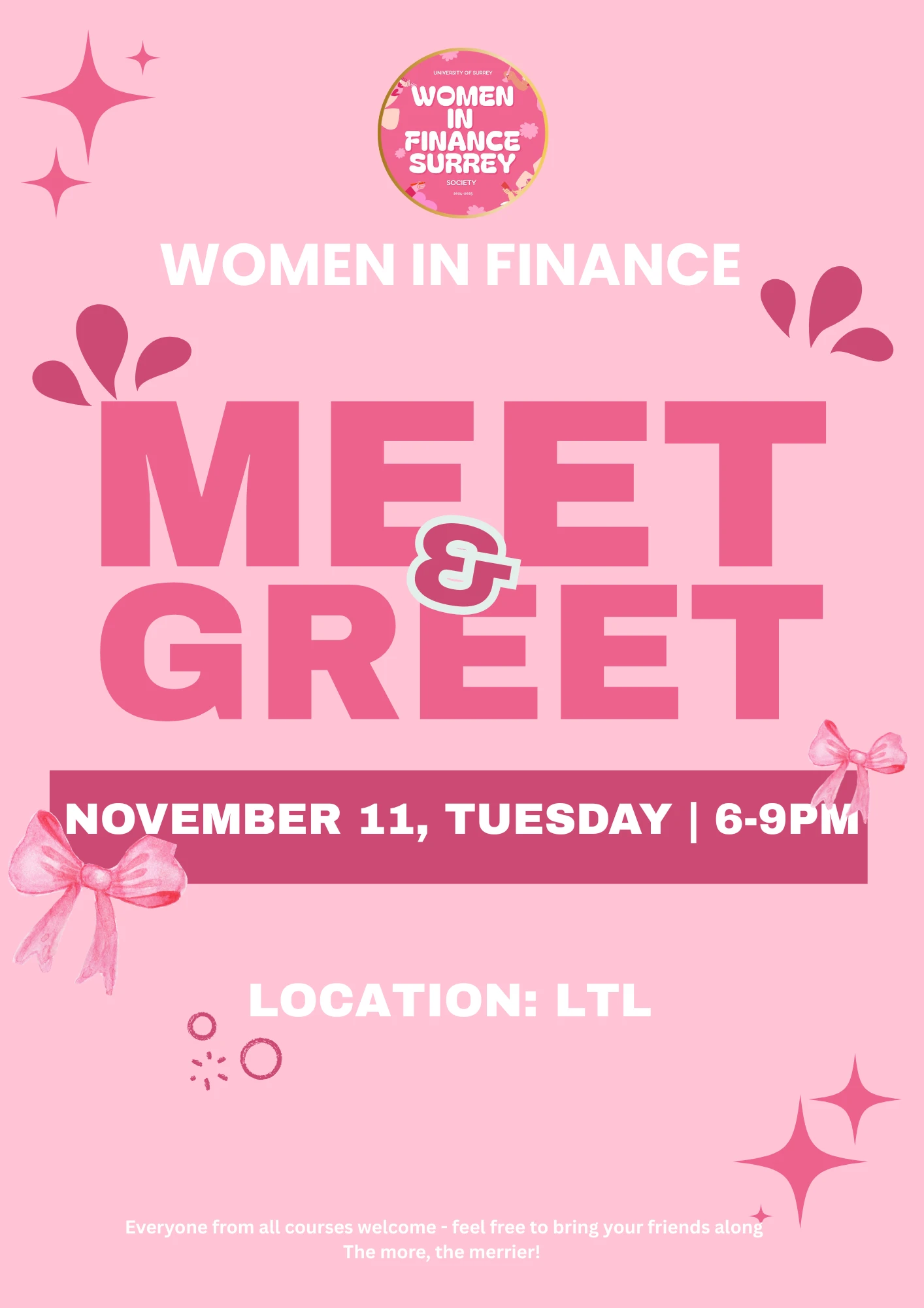 WIFSoc invites you to our first Meet & Greet of the year! Join us to connect with like-minded women passionate about careers in finance and business. Learn more about our vision, upcoming events, and how you can get involved. This is a friendly and informal session to build community, share ideas, and meet fellow aspiring finance leaders. Everyone is welcome, see you there!