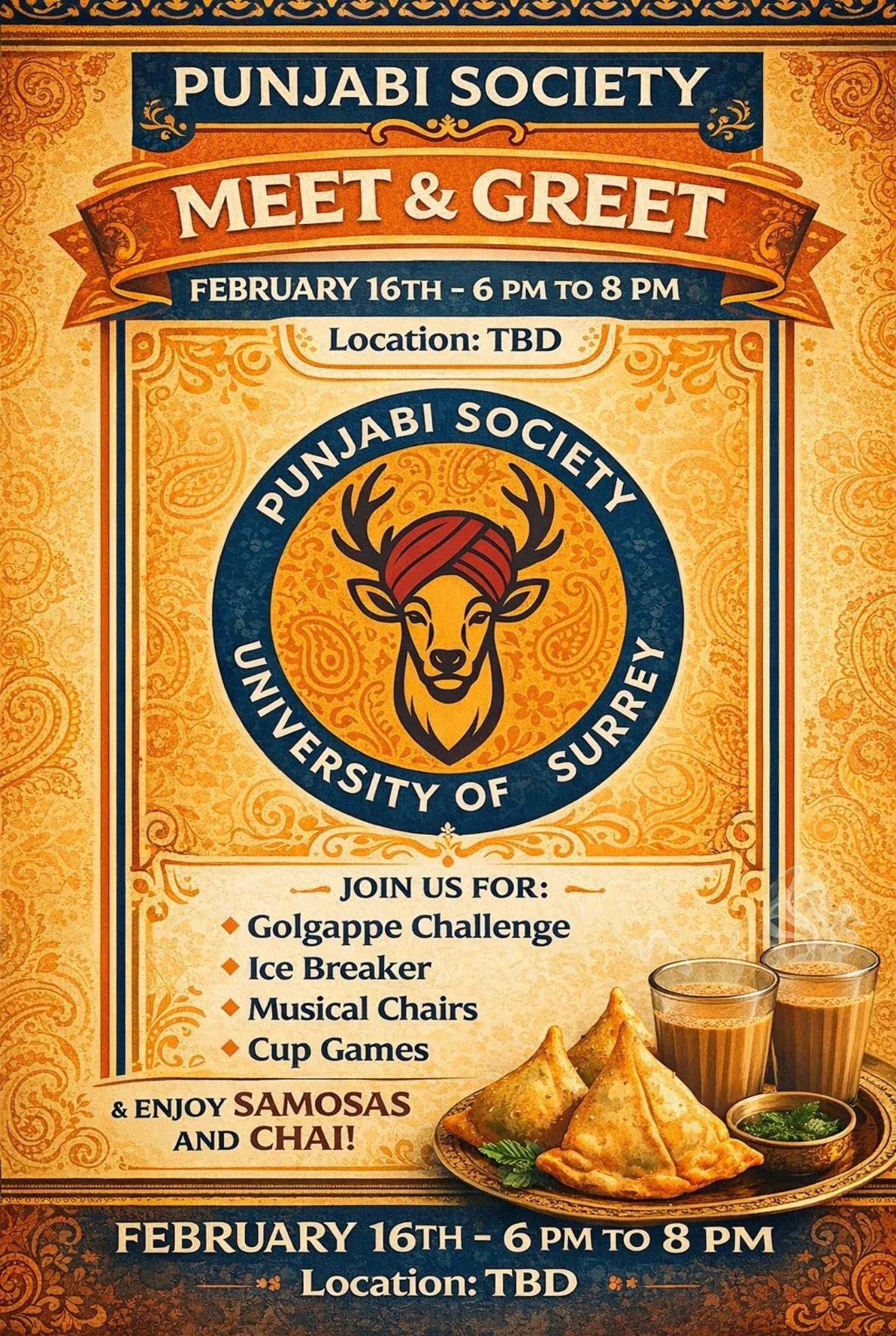 Join us for the Punjabi Society Meet & Greet on 16th February from 6 to 8 PM! 🎉 Come along to meet new people, make friends, and kickstart the year with great vibes. We’ve got fun activities lined up, including a Golgappe Challenge, icebreakers, musical chairs, and cup games—plus delicious samosas and chai to enjoy. Whether you’re new or returning, everyone is welcome. Don’t miss out! 💛 💛 💛 💛