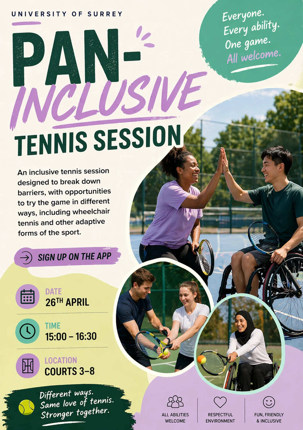 An inclusive, social tennis session open to all abilities, offering the chance to try the game in different ways and learn more about making sport accessible for everyone, including wheelchair tennis and other adapted formats.