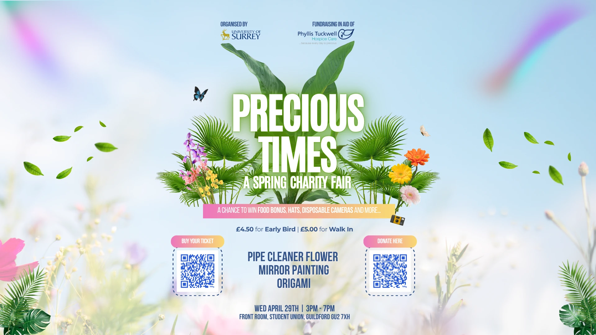 Precious Times : A Spring Charity Fair is a creative community event that connects people together with arts and crafts. Come to join our event who run by event management students of University of Surrey supporting Phyllis Tuckwell Hospice Care, as well as a chance to win a disposable camera!