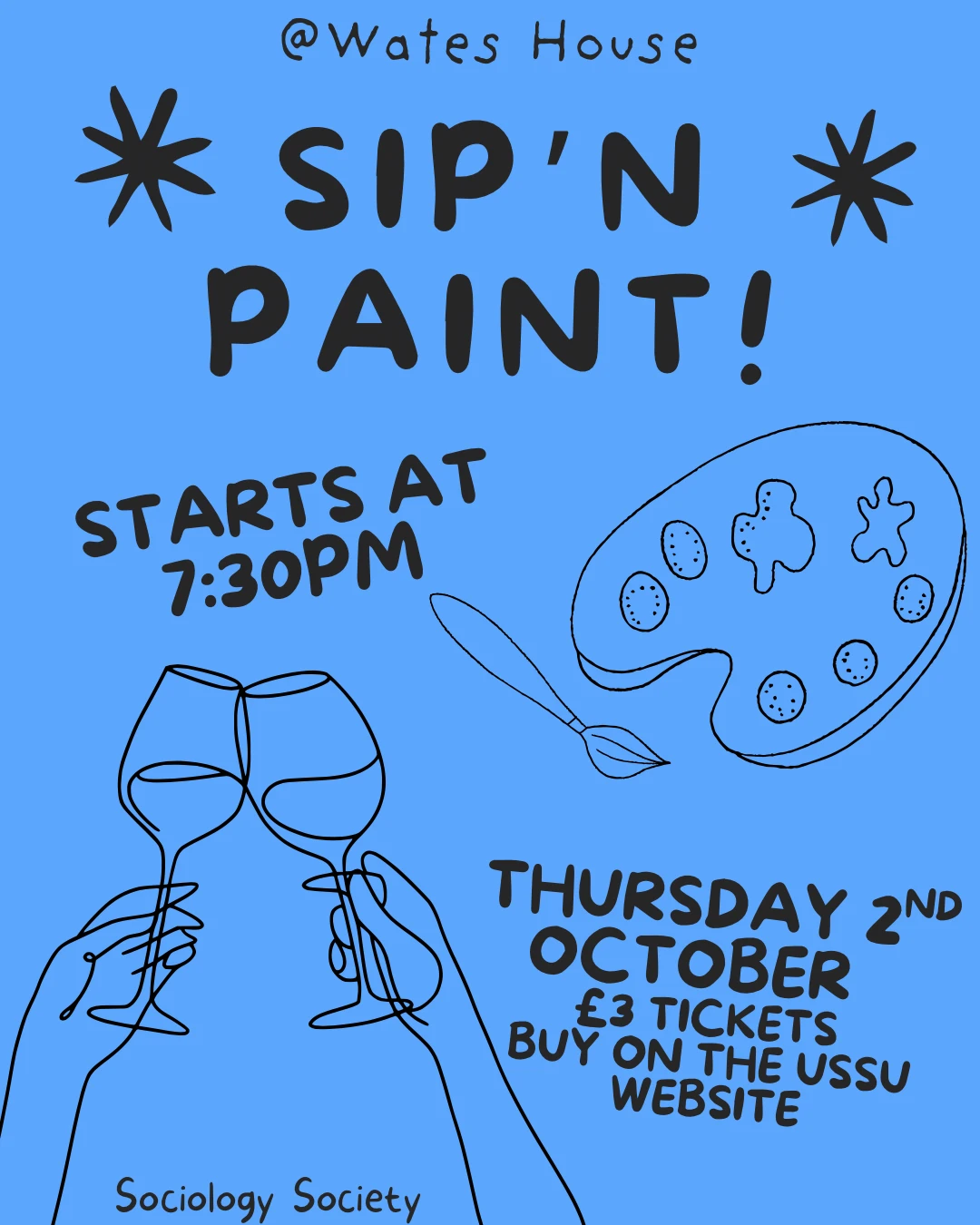 Join us for the first SocSoc Sip n Paint of the yearl Starting at 730pm in the Treetop room at Wates House on main campus. Come have a good time painting, and enjoy a drink too if you want! Drinks and food are avaliable for purchase at the bar in Wates! (No outside food or drink is allowed into Wates House)