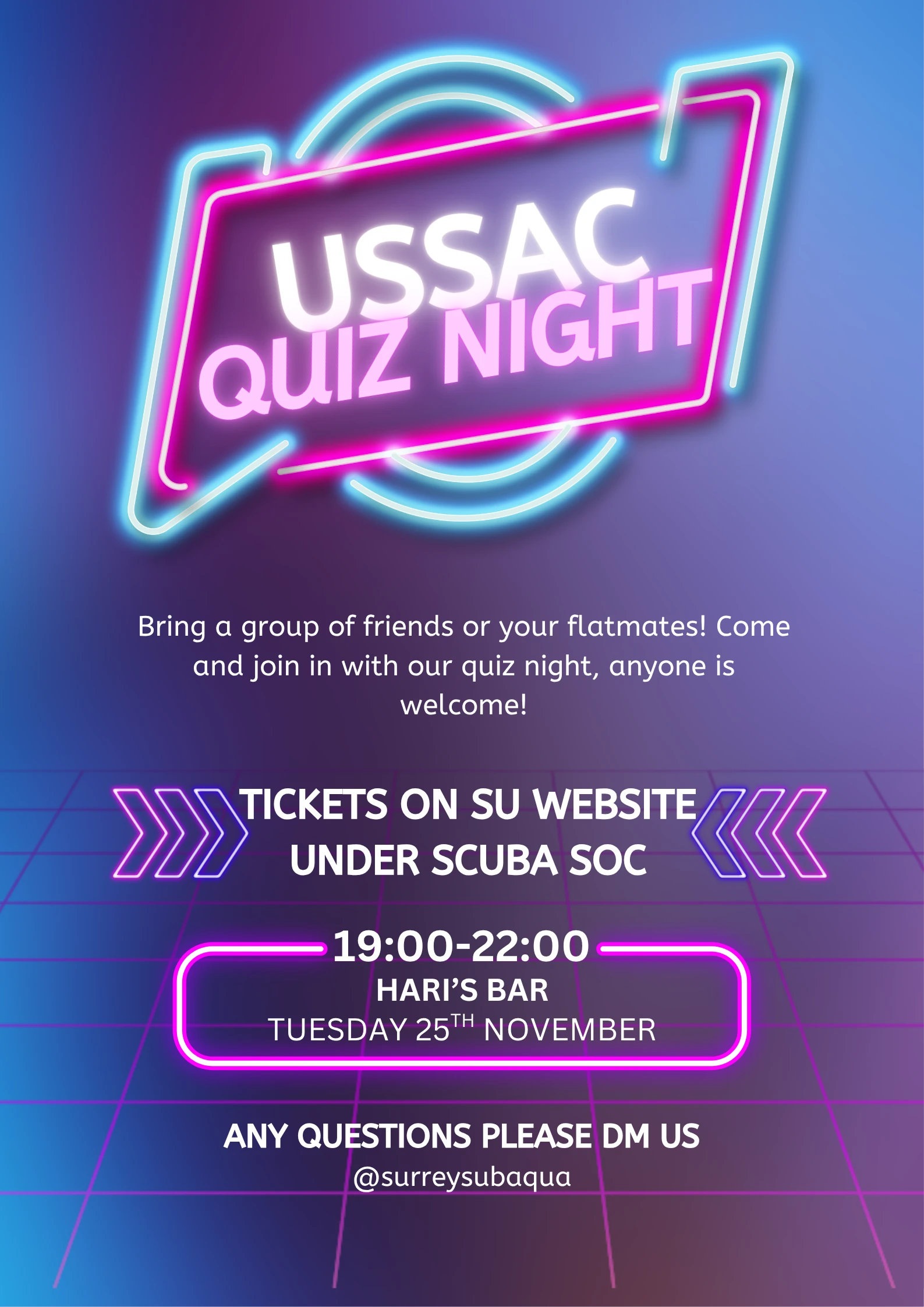 We are hosting a Quiz Night at Hari's Bar, anyone is welcome. Please buy a ticket in advance to avoid missing out. If you are buying a team ticket please message us on Instagram: @surreysubaqua with a list of your 8 team members
